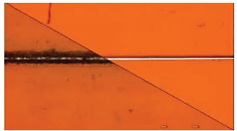 图1:CO2激光(左)与 UV 激光(右)的切割槽比较。UV 激光产生热效应较小,其切割边沿干净、整齐。